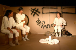 Der Raum ein Karton. Darin Hocker, ein Tuch, eine Kerze. Drei Frauen in irritierender Anstaltskleidung betreten eine irreale Welt. Hier in diesem Sitzkreis mit gestalteter Mitte soll ihnen geholfen werden: In einer Gruppentherapie für Frauen, die sich gegen ihre Schwangerschaft entschieden haben. Während sie auf den Beginn warten, fangen sie an zu erzählen. Wo endet die Selbstbestimmung über ihre Leben, wo beginnt das Recht der Gesellschaft, über sie zu urteilen? Hier darf alles gesagt werden, heißt es. Der Karton mit gestalteter Mitte: ihr Schutzraum. Ob es von den Frauen so wahrgenommen wird, darf bezweifelt werden.